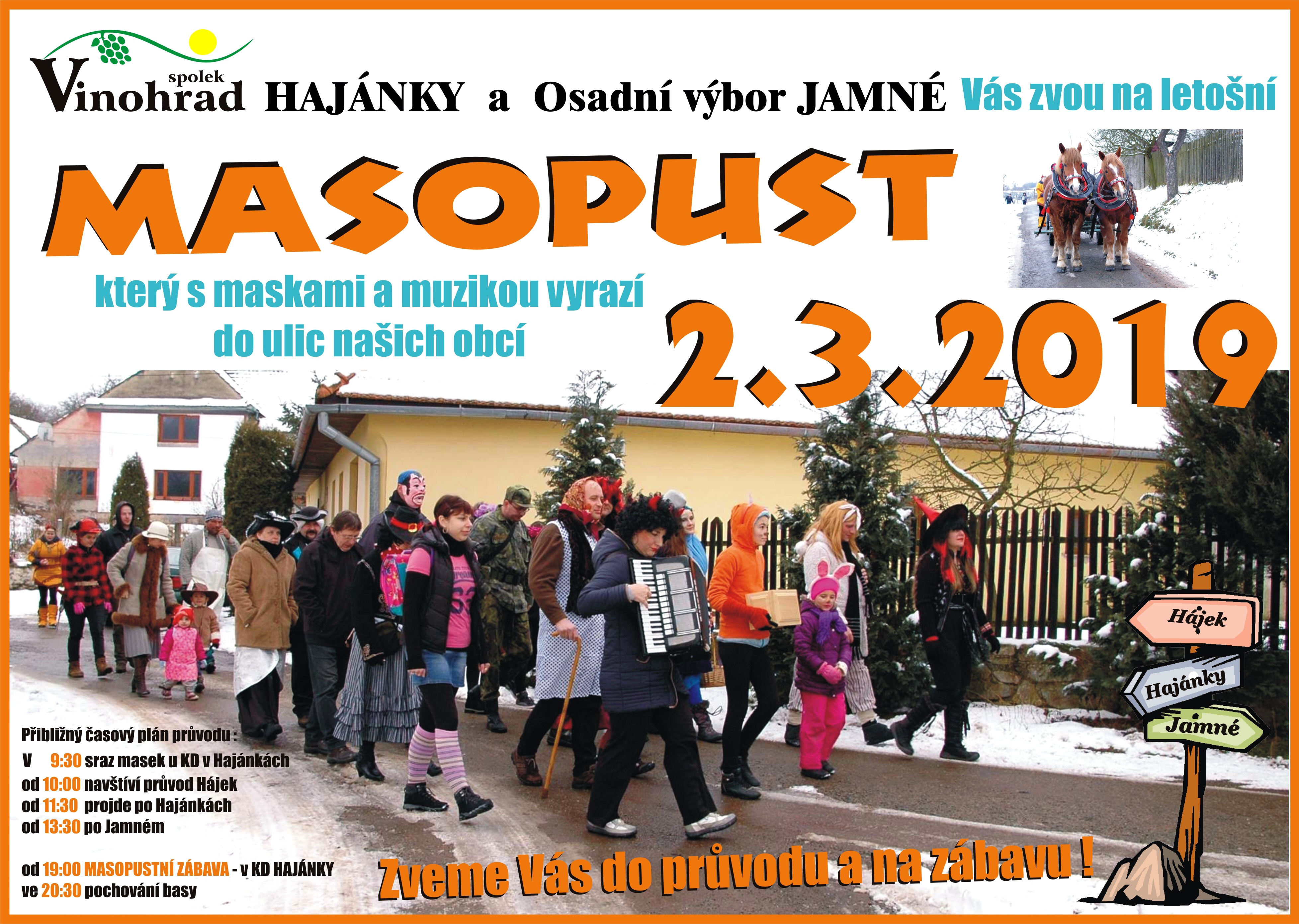 V pořadí 3. Masopust se konal 2.3.2019 a tradičně začínal průvodem po Hájku, Hajánkách a Jamném. V průvodu se sešly různé masky, některé tradiční, některé originální i moderní. Sousedé nás přátelsky přivítali a pohostili. Nakonec následovalo pohřbívání basy a básničky o tom, co se stalo v uplynulém roce včetně prohřešků občanů.
