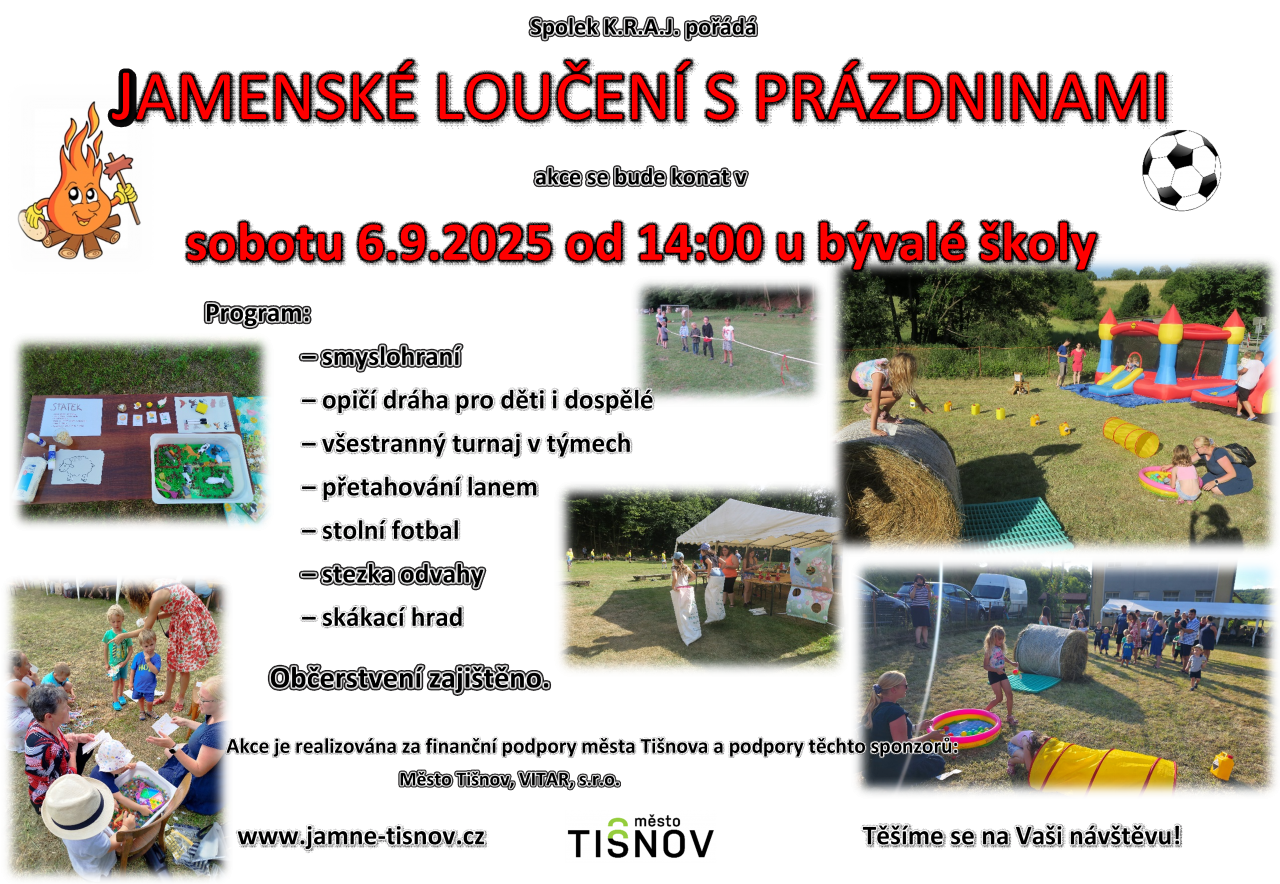 Spolek K.R.A.J. všechny srdečně zve na Jamenské loučení s prázdninami, které se v letošním roce opět uskuteční začátkem září – v sobotu 6.9.2025 od 14:00 hod.